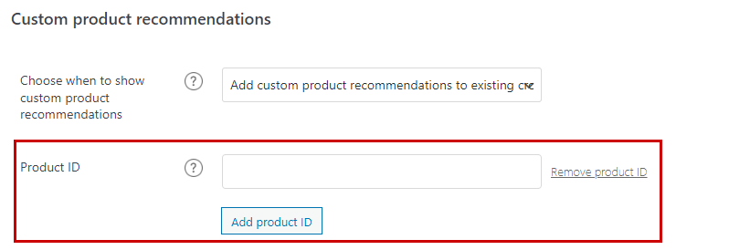 - In the section Custom product recommendations, click Add product ID and type in the ID of the product you want your customers to see among product recommendations. Repeat this for each product you want to add, until you have provided IDs from all of the products you want to use as product recommendations.