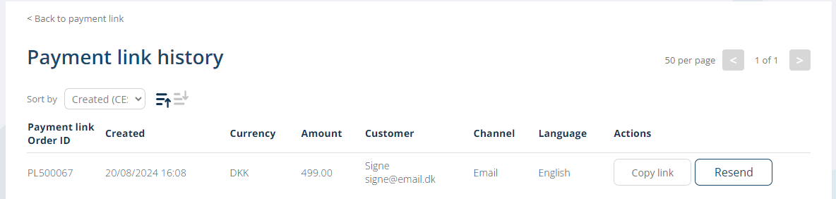 Here you can resend the payment link, if needed, or copy the link URL to send it via your own channels.